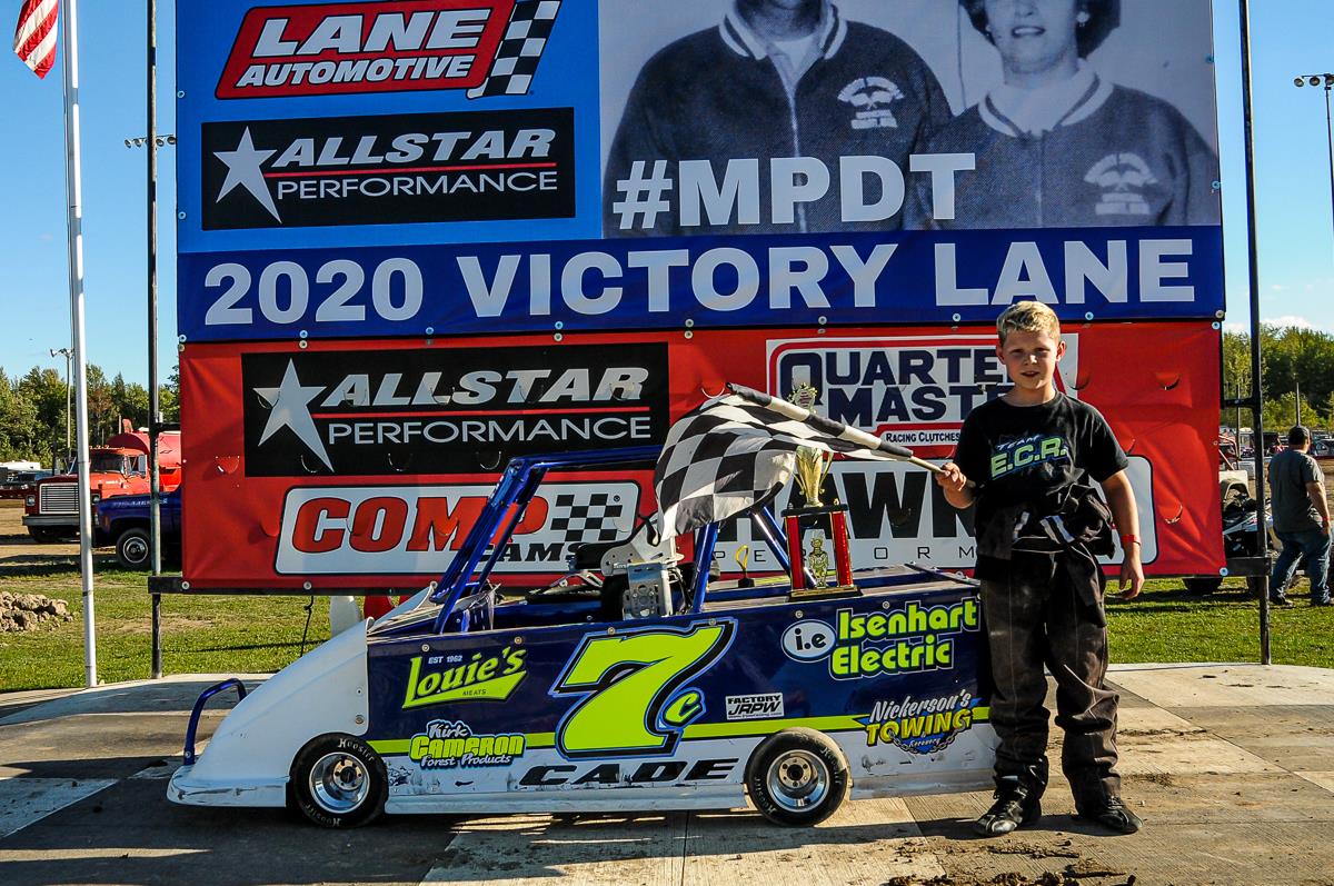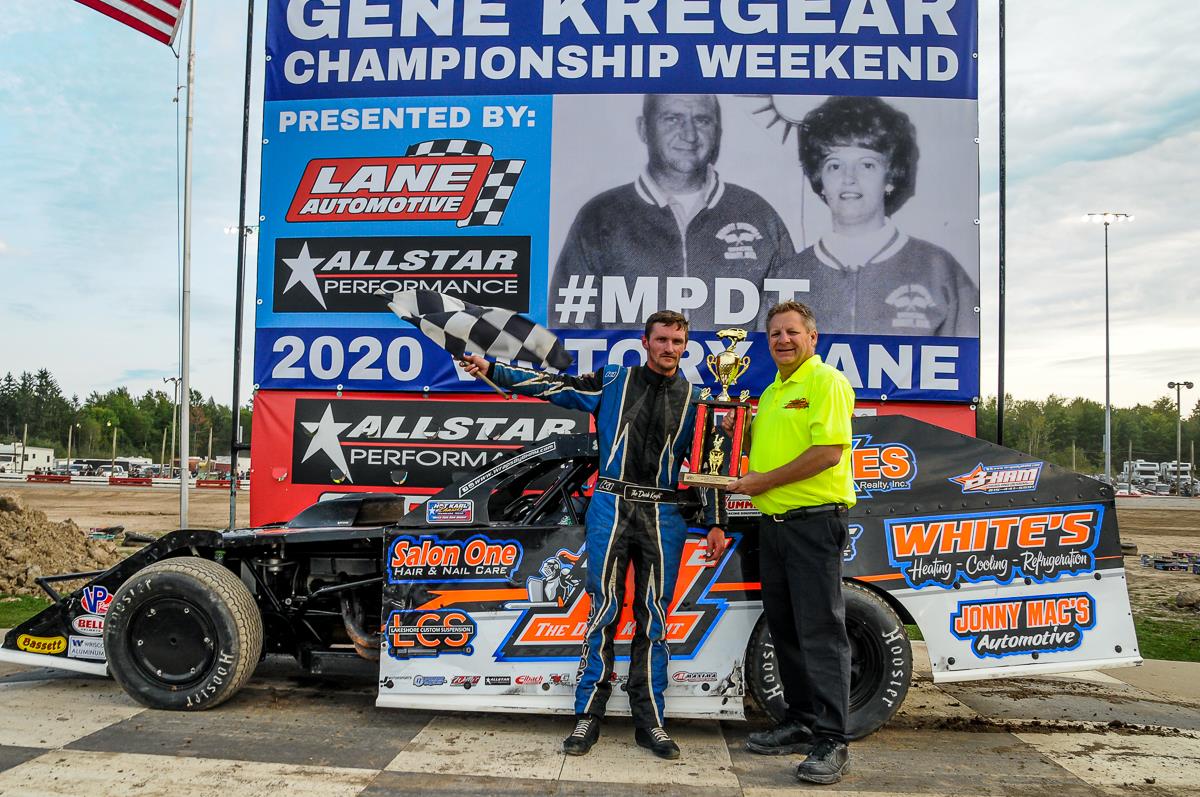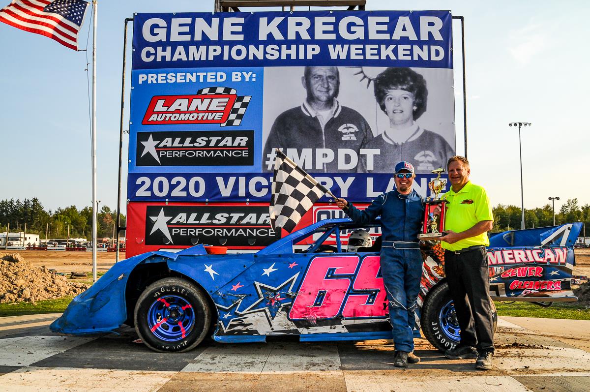 9/07/2020: (Lake City, MI): The 2020 race season for Merritt Speedway ended this past weekend with the running of the annual Gene Kregear Championship Weekend consisting of two days of racing action. The Lake City, Michigan speed plant hosted all of its regular divisions all running for special payouts to help decide the 2020 track championships. The weekend was headlined by the Allstar Performance UMP DIRTcar Late Model challenge series supported by American Ethanol racing for $4000 to win on Saturday and capping off Sunday in a big $10,000 to win main. The Cadillac Tire Center UMP DIRTcar Modifieds, Diesel Freak B-Modifieds, Auto Value Pro Stocks, Lake City Materials Factory Stocks, and XLT Engineering Four & Six Cylinders were all on the property too to complete the full race weekend.