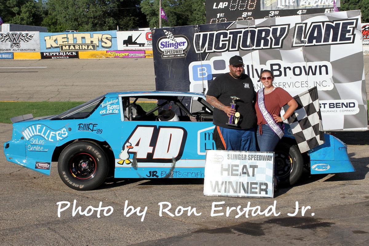 Carl Benn won the 30-lap Slinger Bees feature over Brandon Mennicke and Tom Elsinger Jr. Brian Hillringhouse crossed the finish line in fourth followed by Mitchell Strobel in fifth. Jason Clope finished in sixth place while Misty Benn was seventh ahead of Bill Ostovich Jr. and Scott Emmrich in eighth and ninth. Tracy Neu finished tenth. Al Strobel and Bill Ostovich Jr. were the winners of the Slinger Bees heat races and Ricky Gebhard took top time honors in qualifying with a lap time of 15.243 seconds.