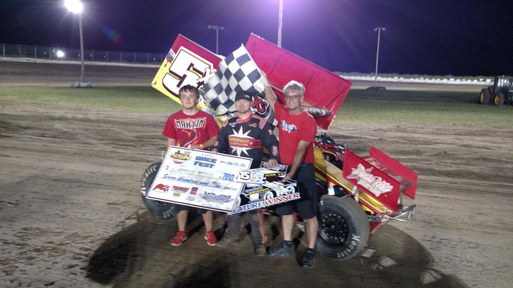 The double header at Butler County Speedway was doubly successful. Jason Martin captured the Sprint Series of Nebraska feature in his SCHNEE Chassis over the fellow EMI car of Trevor Grossenbacher. Jack Dover then claimed his third feature win in a row with the Nebraska 360 Sprint Series later the same evening. Jack paced Billy Alley and the pair of EAGLE cars finished 1-2 two nights in a row. After JDR's fourth win they traveled South to the Kansas State Fairgrounds and took yet another win, the fifth in six races, and kept the momentum rolling. Another Kansas victor was CJ Johnson with the NCRA at 81 Speedway.