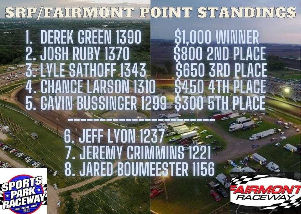 Derek Green with a historic season brings home the State Bank of Fairmont Stock Car Points. Chance Larson brings home second and Luke Sathoff in 3rd.