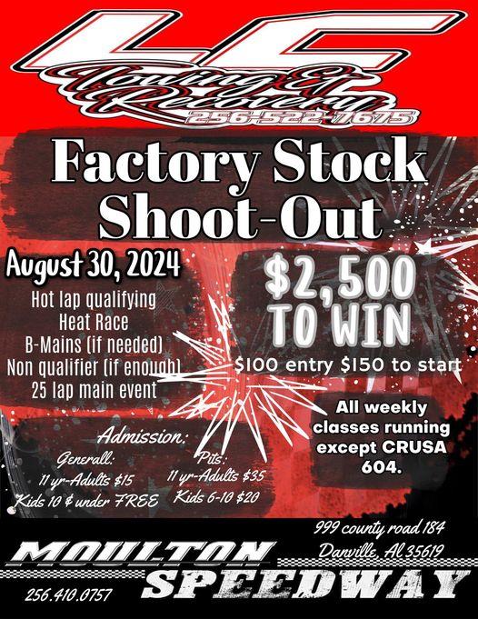 Factory Stocks, it’s time to show up and show out. Moulton Speedway is running a $2500 to win Factory Stock Shoot Out on August 30th.