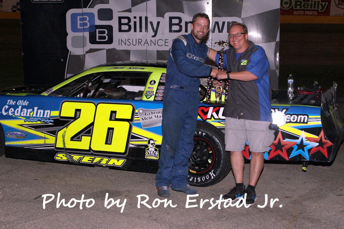 Jack Stern won the 50-lap late model feature over Tom Berens who finished second after leading several laps earlier in the race. Ryan Craine finished third while Ryan Gutknecht and Scott Shambeau finished fourth and fifth respectively. Jake Vanoskey and Ryan Gutknecht were the winners of the late model heat races and Jack Stern lapped the speedway in 12.077 seconds to capture fast qualifier honors.