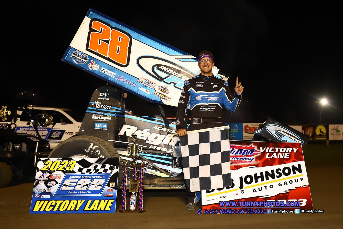 The start of Central New York Speedweek for the Empire Super Sprints concluded the night with a 25 lap A main and after a slow tip over in turn 2 by Tyler Cartier on the initial green flag, Shawn Donath proceeded to put on a dominant performance in the early laps, as he led the way over Jordan Poirier and Matt Tanner. Donath was literally on cruise control and setting a very quick pace on this night leaving Poirier and the rest of the field, to figure out how to keep pace with him. Not even lapped cars were slowing Donath’s pace it was Poirier, Tanner, Paulie Colagiovanni and Jason Barney completing the top 5. On lap 20 the yellow flew for Dalton Rombough, who slowed in turn 2. On the restart Donath continued his dominance and it appeared he was well on his way to the win. On the final lap something broke on Donath’s car allowing Poirier to catch him and take the lead in turn 1. From there the defending series champion would march on to a surprise victory, his 2nd of the season on the ESS Tour. Paulie Colagiovanni finished second with Donath holding on to third despite a broken race car. Jason Barney and Cornwall winner Dylan Swiernik came home 5th.