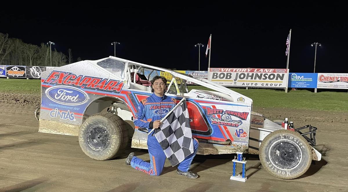 The Whitesboro Plow Shop DIRTCar 358 Modifieds are always exciting but it was not an exciting time for last years runner up in points Ryan Bartlett. At the drop of the green flag Bartlett’s car began to smoke heavily forcing a quick yellow. Under caution the car became engulfed in flames. Bartlett was able to get the car near the safety crew, climb out quickly and was not injured. The restart of the 25 lap even saw Nick Webb take the lead with Matt Caprara, Tyler Meeks, Shaun Shaw and Chris Raabe chasing him. Webb had a strong car in the early laps, but Matt Caprara was strong on this night and began to reel in the race leader. On lap 10 drivers started to enter traffic as the lead battle started to take shape with Webb and Caprara, while Shaw continued to run a distant third. With 5 laps to go Matt Caprara charged to the top of the track in turn 1 and grabbed the lead. Once in front Matt Caprara put it on auto pilot securing his first career win. Webb claimed 2nd with Jordan McCreadie coming from 11th starting spot to finish third, while Shaun Shaw and Tyler Meeks completed the top 5.