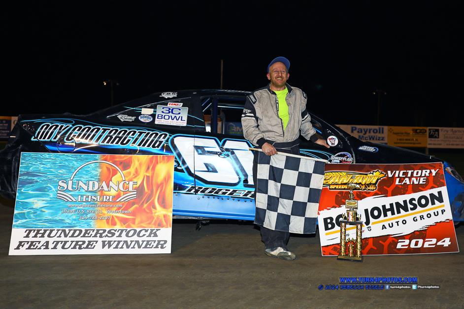 The 15 lap Sundance Leisure Thundercar division saw Justin Pope charge to the lead at the start of the event with Jock Symonds right there with him to challenge. Both drivers put on a great show but Symonds was able to get the top spot back as he tried to pull away. In the mid stages of the race Nathan Powers began to challenge the leaders as he moved into contention near the end of the race. Over the final three laps a new contender emerged as Lyle Robinson made his way to second and put pressure on the race leader. On the final lap off turn two, Robninson was able to make the winning pass as he got by Jock Symonds off the turn. Symonds gave it one last shot off the final turn but Robinson had enough of a lead to secure the season opener. Symonds took second over Nathan Powers, Tony Frezzo and defending track champion Francis White.