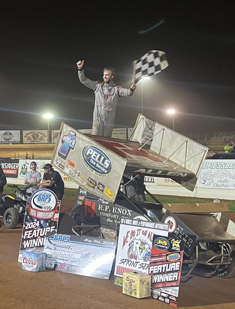 JACOB ALLEN INVADES AND CONQUERS BAPS MOTOR SPEEDWAY’S SPRINT CAR SUNDAY; PA SPRINT SERIES ZACH RHODES TAKES A .739 SECOND VICTORY OVER KEN DUKE JR.