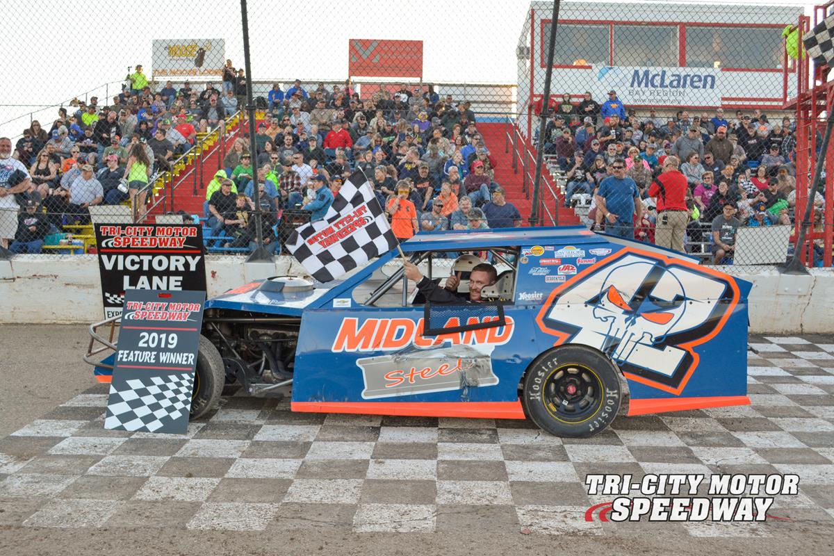 06/07/2019 (Auburn MI) For the first time in the 2019 racing season at Tri-City Motor Speedway the threat of rain was not a factor in the Friday night racing program. With strong confidence that the show would not be interrupted by weather, 124 drivers packed the pit area in hopes of walking away with the checkered flag for their night’s efforts. In addition to the regular show, Midland Steel held their annual Late Model special paying just over $5,000 to the driver leading the 51st and final lap of the main event.
