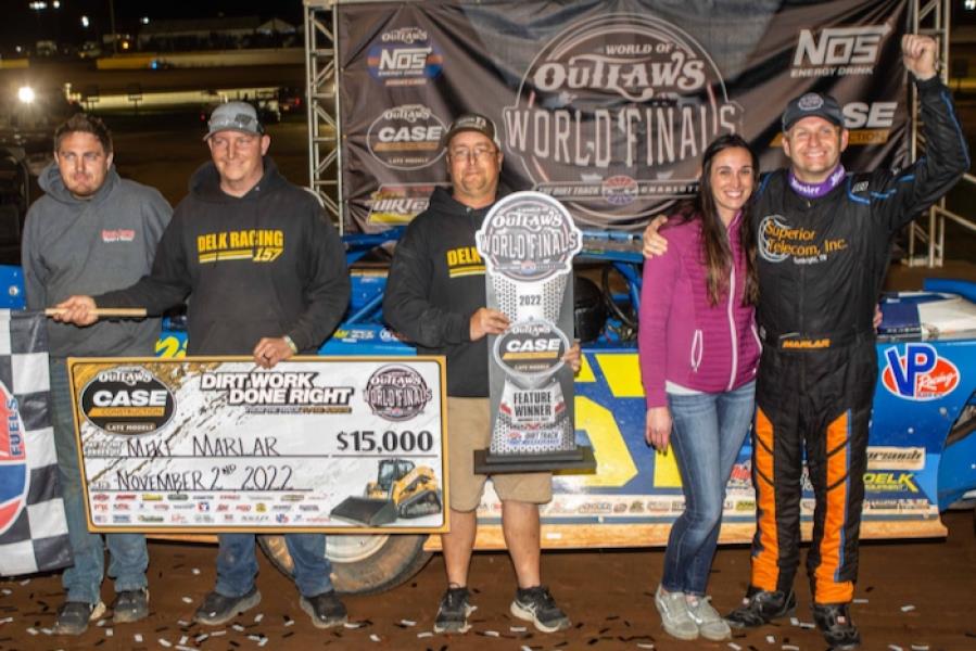 Mike Marlar pushed his 2022-win total to 14 on Thursday night with a World of Outlaws (WoO) Case Late Model Series victory in the opening round of the NGK NTK World Finals at The Dirt Track at Charlotte.