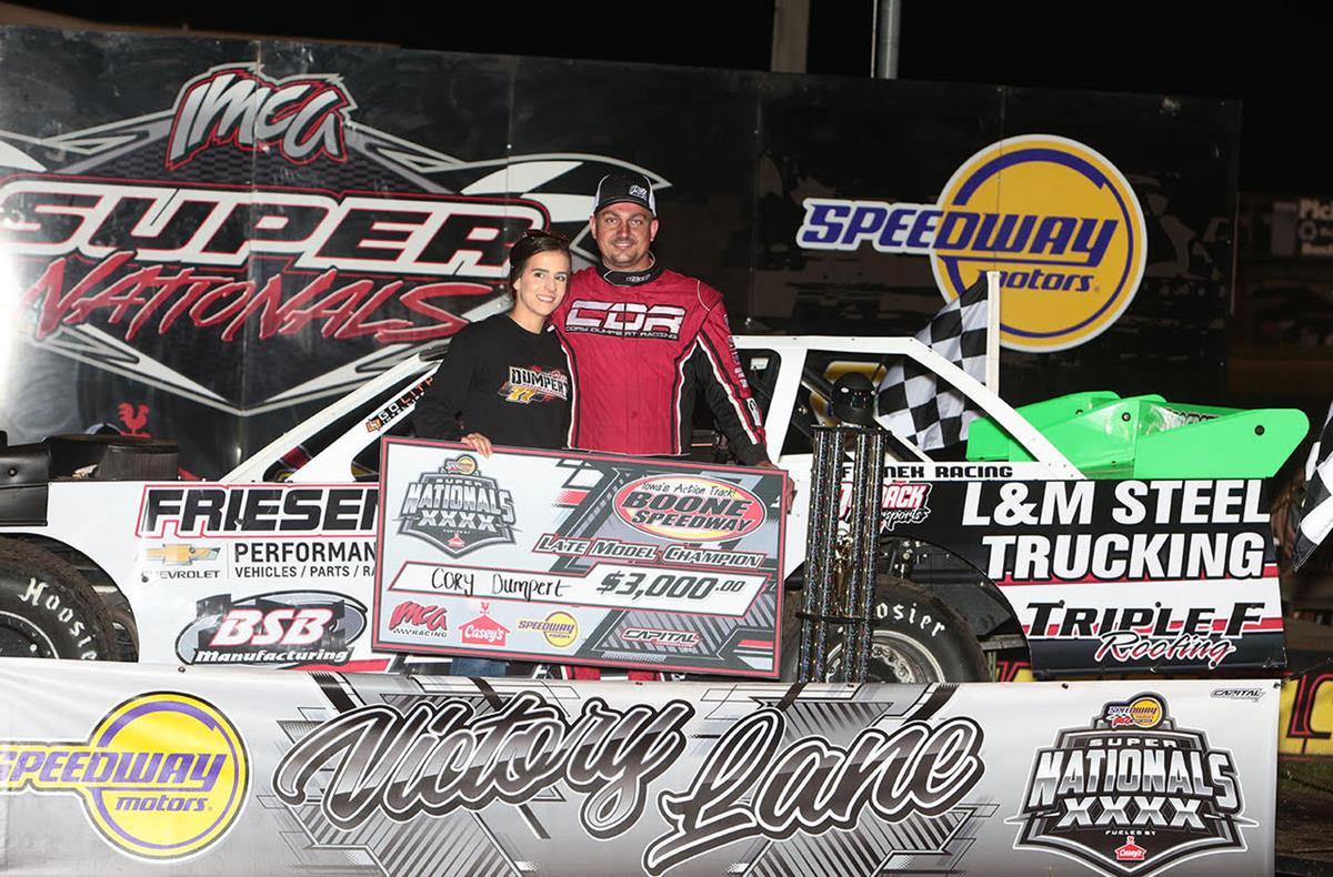 BOONE, Iowa (Sept. 5) – Cory Dumpert wrote his name in the IMCA Speedway Motors Super Nationals fueled by Casey’s history book following an epic battle and an epic finish to Monday night’s Late Model championship event.