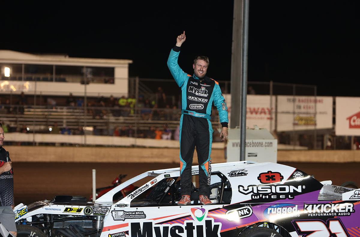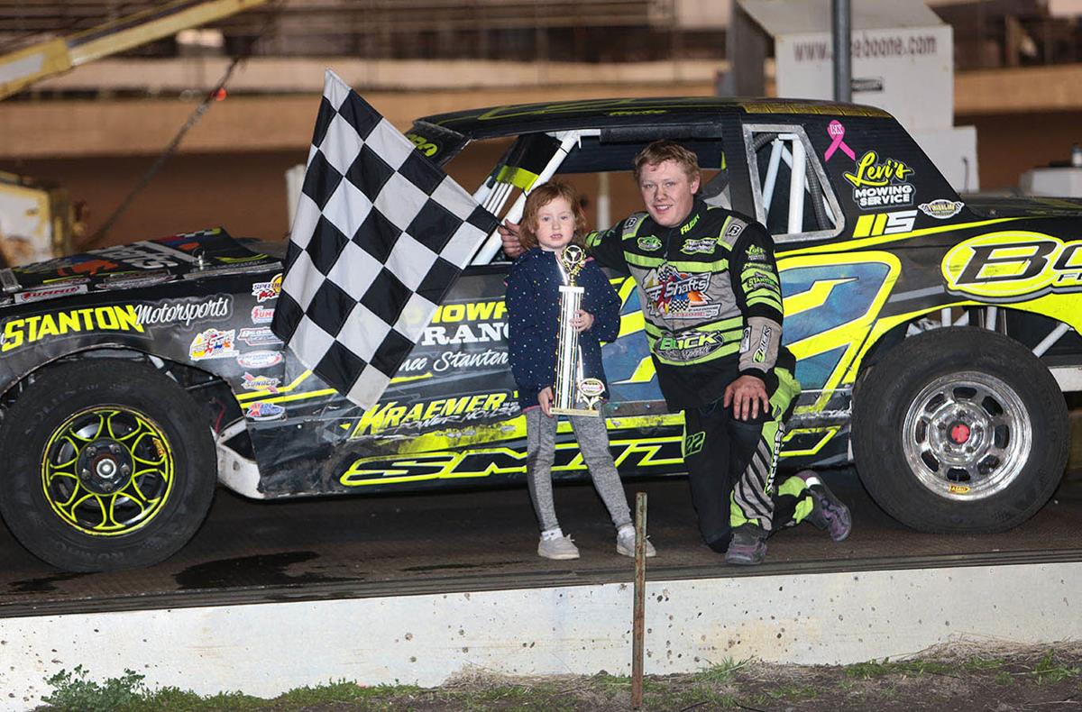 It was looking as if Texas racer Tommy Fain, who hails from Abilene, was going to get a win in the IMCA Sunoco Stock car feature, presented by Boone Moose Lodge. He led through halfway of the 20 lap event, as he continued to hold off the hard charging Jeff Mueller. Mueller was able to nab the lead at lap twelve just before a caution flew. On the restart, cars got shuffled around as the race returned to green, Mueller holding the lead, and now veteran racer Kevin Opheim was on the scene, and running second. Lap 15 saw Opheim take command and hold on the last handful of laps to see the checkers first. David Smith, got by Mueller in the closing laps as they went second and third respectively. Buck Schafroth, Orient, Iowa, was fourth, and Miciah Hidlebaugh, Menlo, Iowa came from thirteenth to finish fifth.