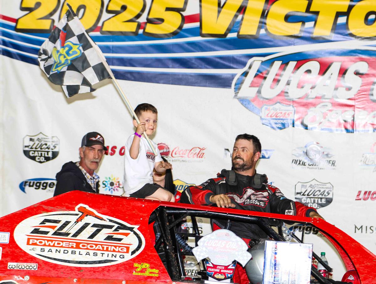 WHEATLAND, MO. (May 17, 2025) - Jon Sheets of Nevada proved too tough to catch Saturday night in the featured event on the Lucas Oil Speedway Pitts Homes and Realty Weekly Racing Series program.