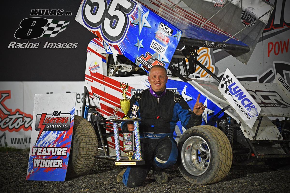 Oak Creek's Mark Heinert continued on a hot streak leading every lap enroute to his third 20-lap Pfeiffer Trailer Sales IRA Lightning Sprints feature win at Wilmot, and fifth on the overall Lighting Sprints series. Cautions with 11 laps and 4 laps to go erased sizable leads, but Heinert was up to the challenges. At the finish it was Heinert followed by Union Grove's Andrew Kiedrowski in second. Pleasant Prairie's Mike Neau was third. Nick Petska of Spring Grove, IL fourth. John Kirk of Johnsburg, IL fifth.