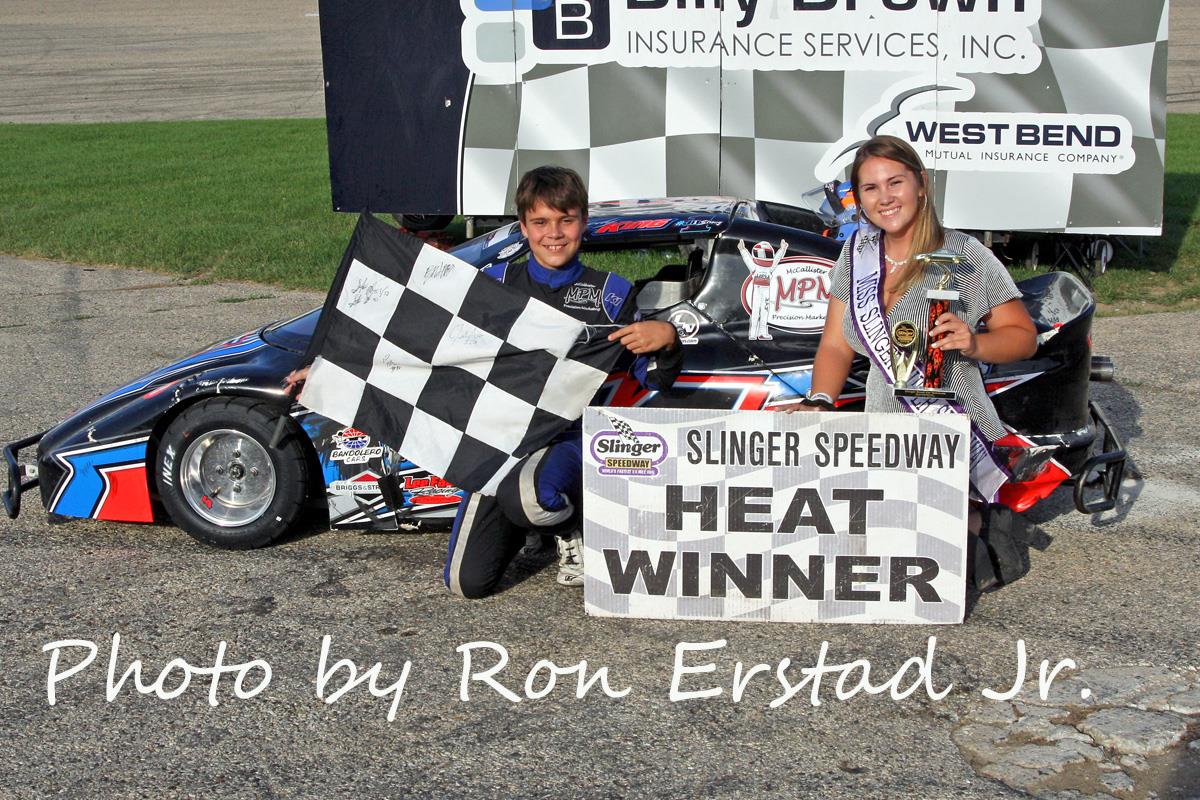The Slinger Bees also raced an extended 30-lap feature and the father-son team of Marty and Brandon Tackes had the field covered as they finished first and second with Brandon scoring the victory. Brandon Berens finished third just ahead of Ricky Gebhard and Jared Apel who finished fourth and fifth. Garrett Konrath won the Slinger Bee semi-feature over Mitchell Strobel and Nick Schmidt. Brady Held and Anthony Dorzok finished fourth and fifth respectively. Slinger Bee heat races were won by Jared Apel, Brandon Berens, and Ricky Gebhard while Brian Stanczyk was the fastest qualifier after turning in a lap at 15.232 seconds.