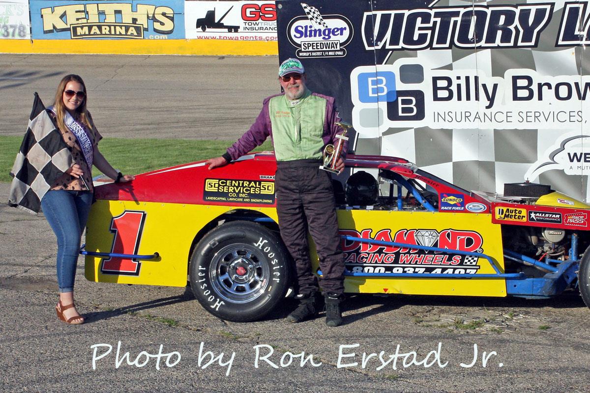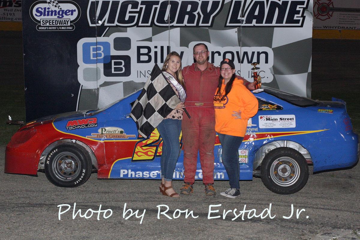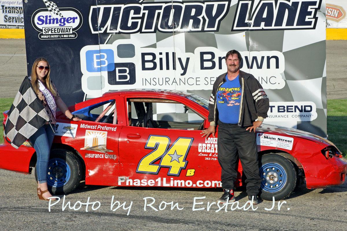 Bobby Gutknecht led at the start of the race and paced the opening ten laps before Ryan Gutknecht took over the lead on lap 11. Bobby Gutknecht and Dale Lecus Jr. got together in turn three while racing towards the front of the field on lap 19 to draw the only caution flag of the event with Ryan Gutknecht leading over Jacob Schraufnagel, Jay Kalbus, and Andrew Meyerhofer. Once racing resumed, Ryan Gutknecht could not be caught and he charged to the victory while Schraufnagel held off Kalbus for second. Dan Calhoun made is first Slinger appearance of the season and finished fourth while Dale Lecus Jr. recovered from the earlier incident to finish fifth.