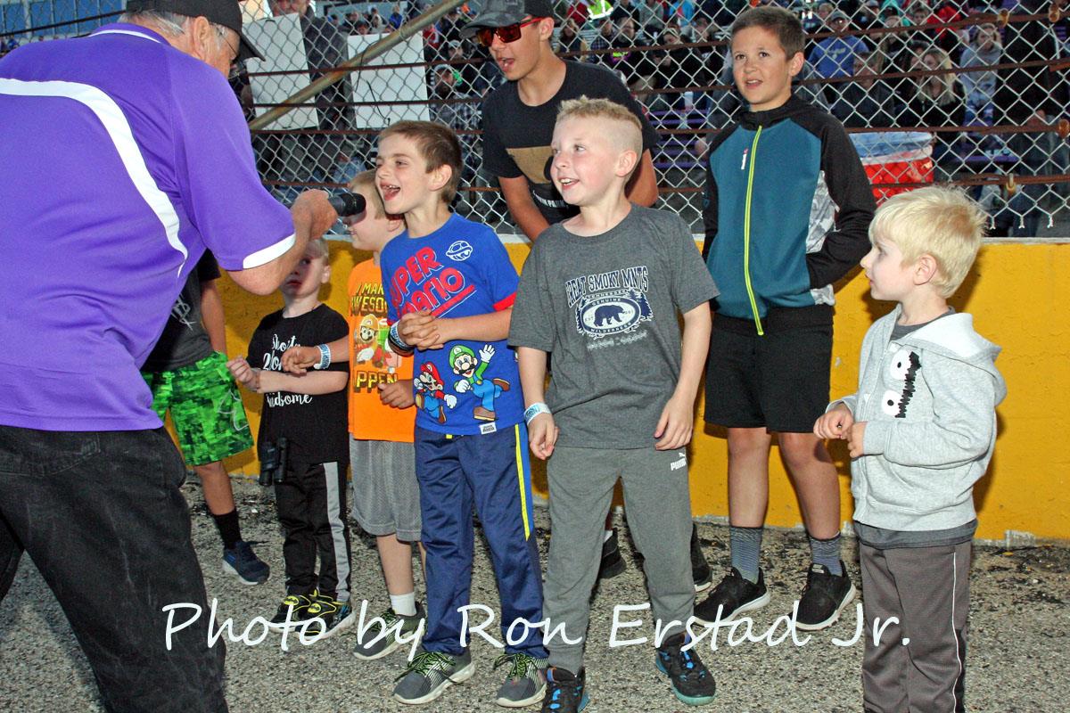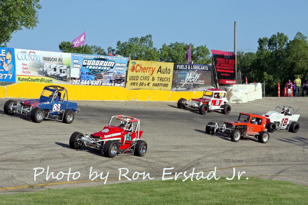 Steve Bergdorf drove his vintage 1958 Chevy all steel body modified to the win in the vintage exhibition race and the entry from the Slippery Rail in Allenton was driven to victory in the Bar Cars race. Rick Bruskiewicz edged Russ Lorbiecki to win the thrilling nine car Figure 8 race and at 9:03pm the racing program was completed and everyone was invited in the pits.
