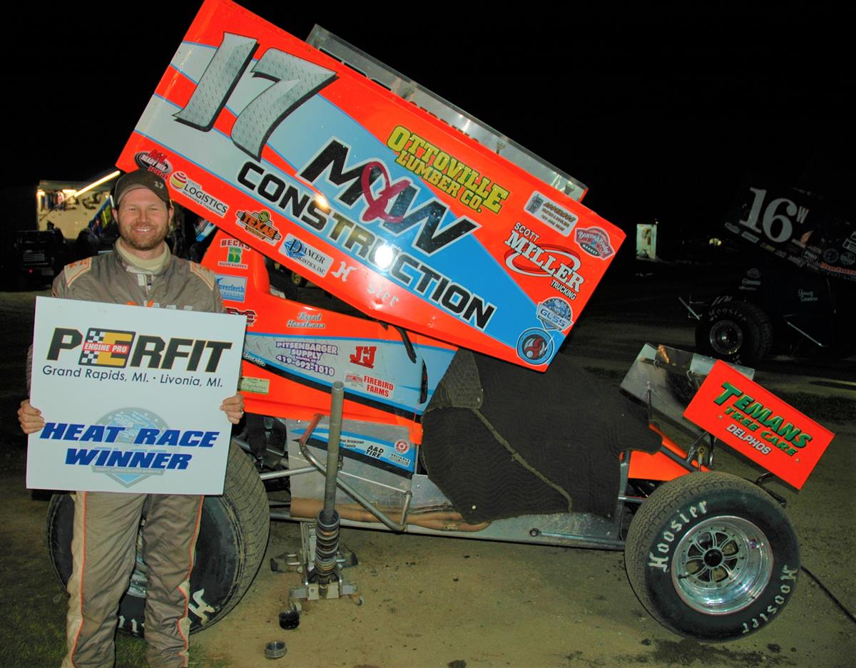 Chase Ridenour (Perry, MI), the GLSS 2016 Champion, leads the Perfit/Engine Pro Heat 4 onto the track. As the green flag flies and the cars charge into turn 1, Gressman, Ridenour and 2017 Champion Jared Horstman(Cloverdale, OH) are 3 wide. Gressman tries to squeeze down the bottom under both, when he clips the infield tire and snaps his front axle. Joel Hummel (Nashville, MI) came to rest at the exit of turn 2 after losing his front left wheel. With Gressman and Hummel out, Ridenour jumps out front on the restart and is battling Horstman the whole way. Getting a little gap as he takes the white flag, Ridenour is cruising the cushion in turns 1 and 2 when he loses all power and goes off the track. On the restart, Horstman leads the field across the finish line with Ruhl, Brad Lamberson (Parma, MI) and Andy Chehowski (Coldwater, MI) transferring into the A-Main.