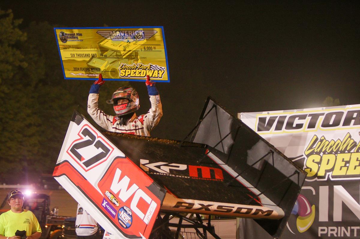 A green, white, checkered finish would decide the $6,000 payday. Gennetten would have an outstanding restart and challenge on the low end of the speedway. Gennetten and Axsom would battle down the backstretch and into turn 3. Axsom would hit the rut in turn 4 and Gennetten would take the lead at the white flag. Axsom would power one last time around the speedway and take the lead on the backstretch, Gennetten would battle into turn three, but out of turn four Axsom would win at Lincoln Park Speedway. Gennetten second, and Windom would round out the podium.