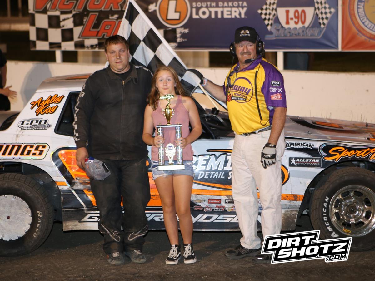 An exciting Great Western Bank USRA B-Modified feature had the #27 of Tyler Myers taking his first career I-90 Speedway in from seventh on the starting grid. Brock Hess went +10 to take second with Camden Myers third. Ray Feltman and Justin Voeltz completed the top five.