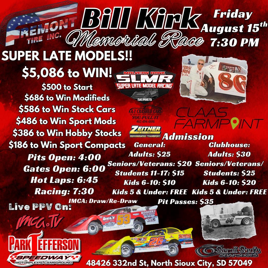 The Super Late Model Racing Series returns to Park Jefferson Speedway Friday August 15th for the first time since 2018. The Midwest's premier late model touring series takes center stage at Park Jefferson for the Fremont Tire Bill Kirk Memorial Race presented by Claas Farmpoint - Iowa! The Super Late Models race for a cool $5,086 to win. Also in action will be IMCA Modifieds, Stock Cars, Sport Mods, Hobby Stocks, and Sport Compacts for a track points night and increased win pay in each class. A crucial points night for weekly competitors as Season Championship Night is the following Friday, August 22nd.