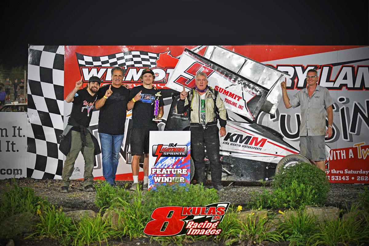 John Kirk of Johnsburg, IL scored a spin to win for his first Pfeifer Trailer Sales IRA Lightning Sprints 15-lap feature at Wilmot this season. Kirk took the initial lead. Five laps into the main Kirk got sideways in turn two, nearly spinning in front of the field. Briane Strane Jr. of Paris shot low and briefly into the lead.