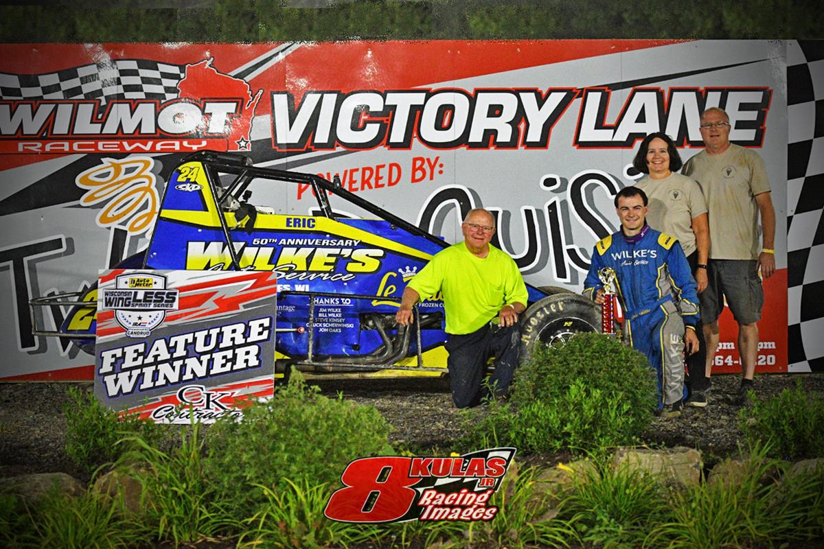 The Bill Grogan Tribute for the CK Contractors/AutoMeter powered by Gandrud Performance Products Wisconsin Wingless Sprints 20-lap Feature was won by Genesee’s Eric Wilke in a wild green-white-checkered finish.