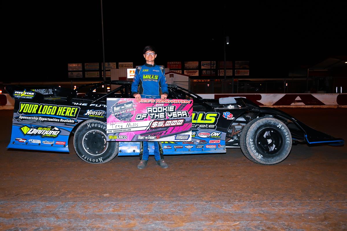 Collecting nine Top-10s, four Top-5s, and his first career Super Late Model victory at Whynot (Miss.) Motorsports Park, Trey Mills secured the 2023 Rookie of the Year title and earned $5,000 for his accomplishment.