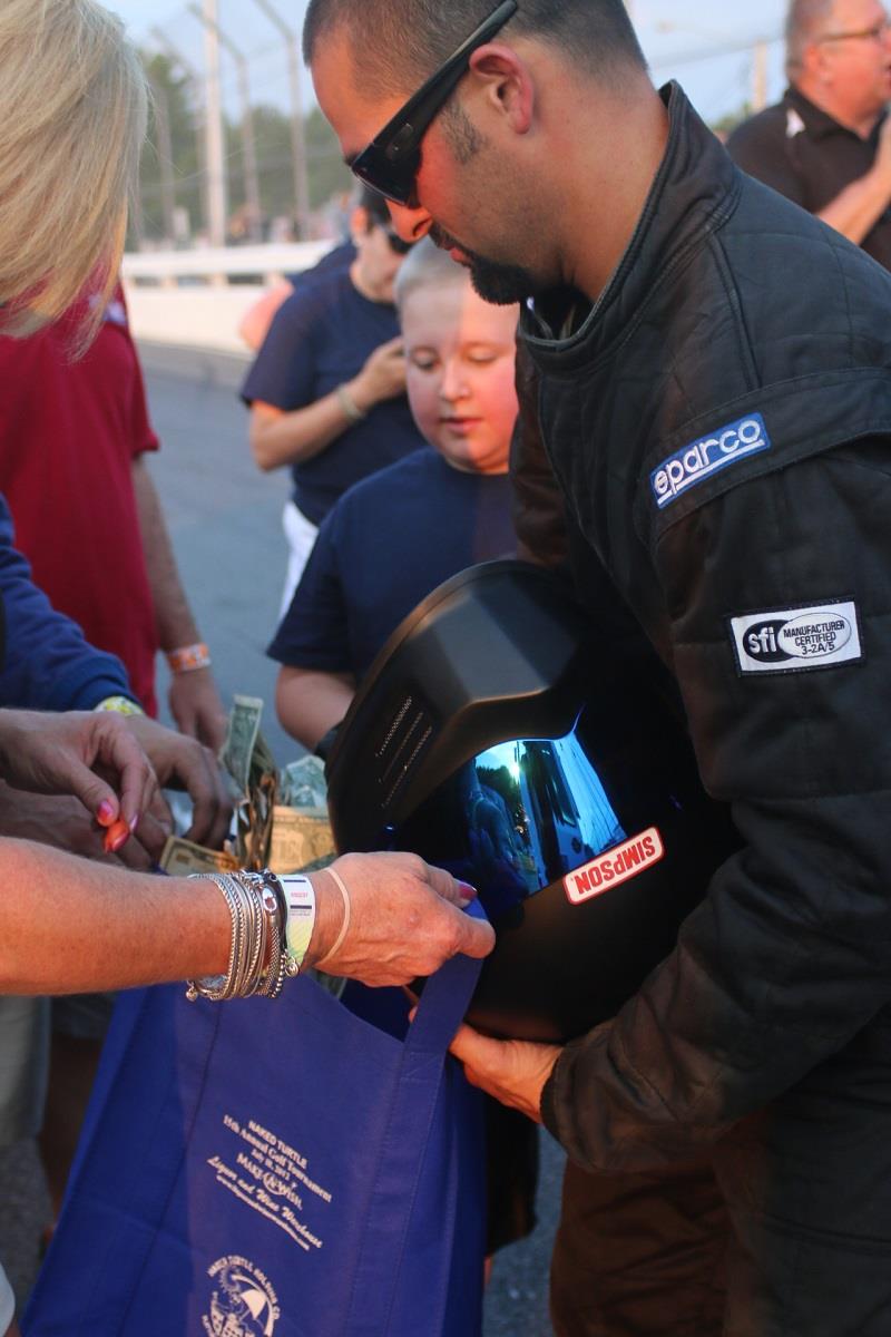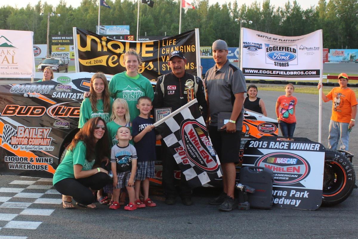 The “Battle of Plattsburgh” event was sponsored by Unique eCigs, Egglefield Ford, Morrisonville Septic, High Peaks Dental, and Liquor & Wine Warehouse. The Carpenter family and Liquor & Wine Warehouse coordinated a fundraiser for the Make-A-Wish Foundation at intermission with drivers passing their helmets through the grandstands and raising over $3,000 in just 15 minutes. “Wish Kid” Dmitri Duval, age 10, waved the green flag to start the first Mini-Mod race and was also taken for a ride around the speedway aboard the #7 Modified race car with driver Codie Aubin as part of the festivities.