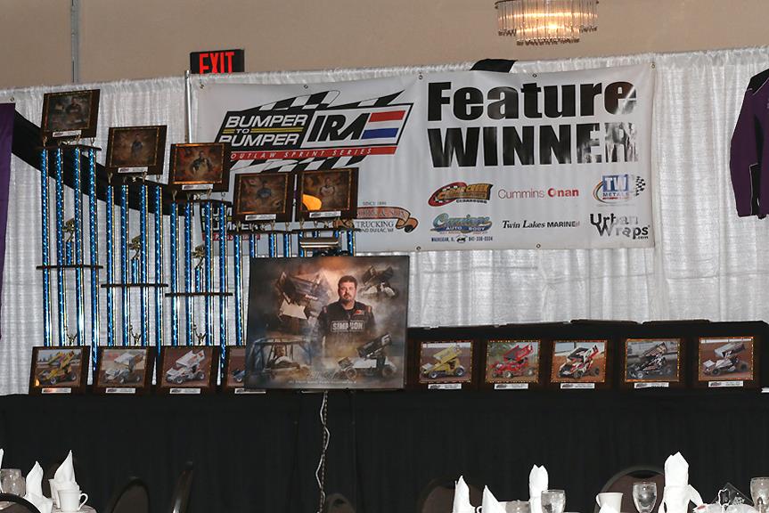 IRA President Steve Sinclair honored videographer Jeff Fischer (Grandstand Video), and photographer/graphic designers Rob Eisentraut (RC Custom Design), David Frickie (Urban Wraps), and Dave Olson (Studio 360), plus media members Dana & Paul Kuyawa with Appreciation Awards, while Sinclair later accepted an award on behalf of the Bumper To Bumper IRA Outlaw Sprint Series from Jim Eckert of the Disabled American Veterans. The group had successful fundraising events at Wilmot Raceway IRA events.