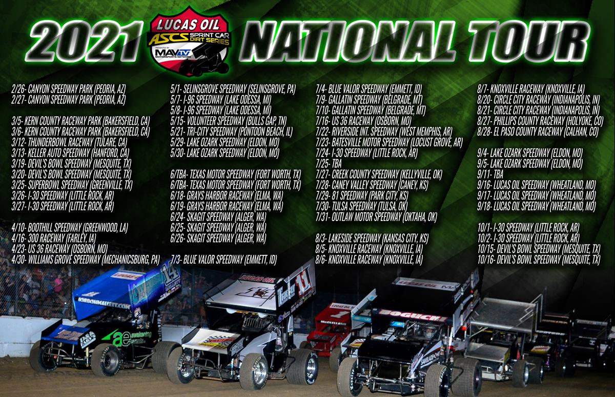 Bryan Hulbert – TULSA, Okla. (December 15, 2020) Celebrating the 30th year of racing with one of the largest National Tour lineups in the history of the series, the Lucas Oil American Sprint Car Series presented by the MAVTV Motorsports Network is set for 61 events in 2021.