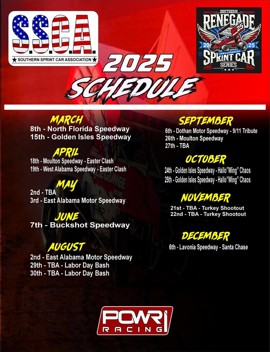 Populating the POWRi SSCA yearly agenda, Night Two of the Easter Clash on April 19th will witness a lone trip to West Alabama Speedway, in Winfield Alabama, as well as a single series trip to Buckshot Speedway, in Clanton Alabama, on June 7th, with Dothan Motor Speedway welcoming racers in the 9/11 Tribute on September 6th.